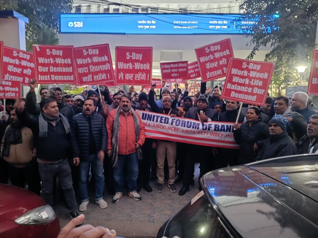पटना-कार्यालय प्रतिनिधि। यूनाइटेड फोरम ऑफ बैंक यूनियन्स (यूएफबीयू) के आह्वान पर पाँच दिवसीय कार्य सप्ताह की माँग को लेकर मंगलवार को पटना में बैंककर्मियों ने जोरदार प्रदर्शन किया। पश्चिमी गांधी मैदान के समीप भारतीय स्टेट बैंक की मुख्य शाखा के पास आयोजित इस कार्यक्रम में 800 से अधिक बैंककर्मी शामिल हुए।