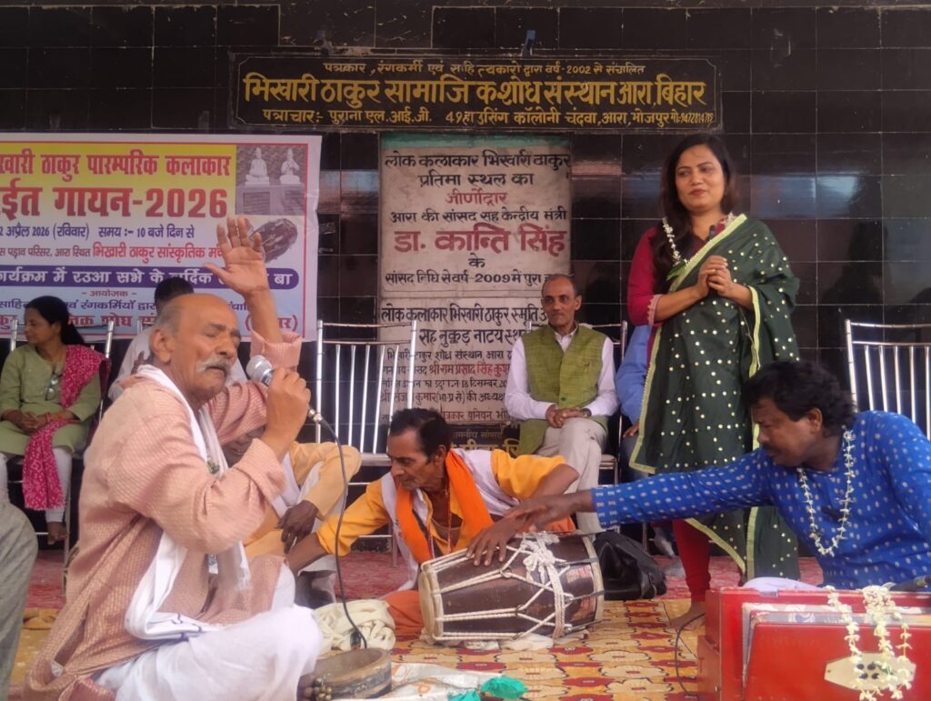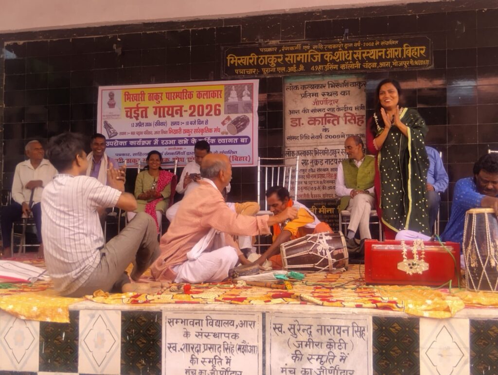 आरा। स्थानीय सरदार पटेल बस स्टैंड परिसर में भिखारी ठाकुर सामाजिक शोध संस्थान, आरा द्वारा “भिखारी ठाकुर पारम्परिक कलाकार चईत गायन–2026” का भव्य आयोजन किया गया।