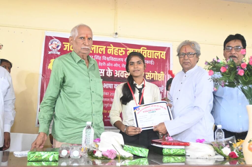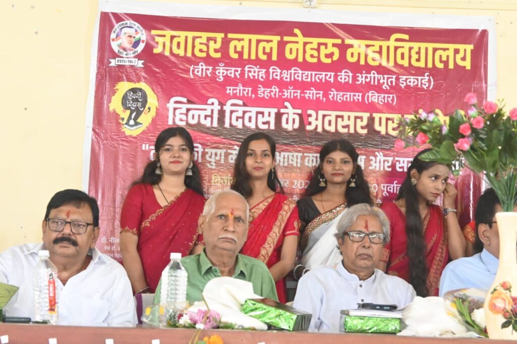 डेहरी -आन-सोन (रोहतास)- कार्यालय प्रतिनिधि। स्थानीय जवाहरलाल नेहरू महाविद्यालय में हिंदी विभाग के तत्वावधान में संयोजित हिंदी दिवस समारोह में “तकनीकी युग में हिंदी भाषा का विकास और सम्भावनाएंं” विषयक संगोष्ठी हुई, जिसका उद्-घाटन महाविद्यालय के प्राचार्य डा. शैलेंद्र कुमार ओझा, मुख्य अतिथि प्रो. रमेशचंद्र सिंह , विशिष्ट अतिथि बाबा नागार्जुन स्मृति सम्मान से सम्मानित कवि कुमार बिंदु एवं शंकर कॉलेज के हिंदी विभागाध्यक्ष डॉ. अरुण कुमार ने दीप प्रज्ज्वलित करके किया। कार्यक्रम की संयोजिका डॉ. नीलम पाल ने स्वागत भाषण देते हुए हिंदी भाषा की महत्ता पर प्रकाश डाला। वहीं, कॉलेज की छात्रा ज्योति, प्रीति, कशिश, आकृति, सलोनी एवं मुस्कान आदि छात्राओं ने समवेत रूप से सरस्वती वंदना व स्वागत गान पेश किया। महाविद्यालय के प्रधानाचार्य प्रोफेसर शैलेंद्र कुमार ओझा ने सभी अतिथियों को अंग वस्त्र, प्रतीक चिन्ह एवं बुके देकर सम्मानित किया।