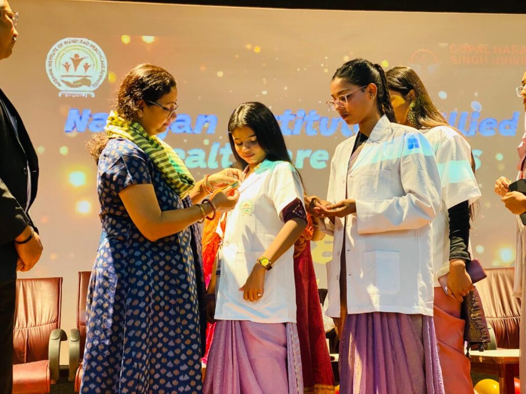 डेहरी-आन-सोन (रोहतास)- विशेष संवाददाता। गोपाल नारायण सिंह विश्वविद्यालय परिसर स्थित नारायण इंस्टीट्यूट ऑफ एलाइड एंड हेल्थकेयर साइंसेज (एनआईएएचएस) में 2024 बैच के छात्रों द्वारा नवप्रवेशित विद्यार्थियों के स्वागत में फ्रेशर पार्टी, बैज सेरेमनी एवं शपथ ग्रहण समारोह का भव्य आयोजन किया गया। कार्यक्रम उत्साह, गरिमा और शैक्षणिक वातावरण के बीच संपन्न हुआ।