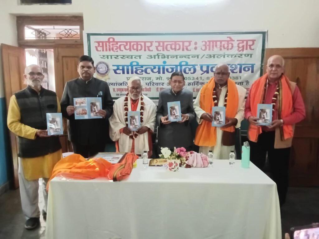प्रयागराज-(उत्तर प्रदेश)। साहित्यांजलि प्रभा से प्रवर्तित साहित्यांजलि प्रकाशन, प्रयागराज द्वारा आयोजित भव्य समारोह में वरिष्ठ साहित्यकार जनकवि जय प्रकाश शर्मा ‘प्रकाश’ को साहित्य रत्न सम्मान से अलंकृत किया गया। यह सम्मान साहित्यकार सत्कार : आपके द्वार योजना के अंतर्गत प्रदान किया गया।गोविंदपुर स्थित शिवासिटी मॉन्टेसरी स्कूल के सभागार में आयोजित कार्यक्रम की अध्यक्षता ख्यातिलब्ध साहित्यकार डॉ. शंभूनाथ त्रिपाठी ‘अंशुल’ ने की, जबकि मुख्य अतिथि के रूप में माननीय सुधीर नारायण उपस्थित रहे। अतिथियों ने जनकवि को सम्मान प्रतीक-चिह्न और अंगवस्त्र प्रदान कर अभिनंदित किया। इसी अवसर पर उनकी 55वीं कृति ‘क्या खोया क्या पाया’ काव्य संग्रह का लोकार्पण भी किया गया।