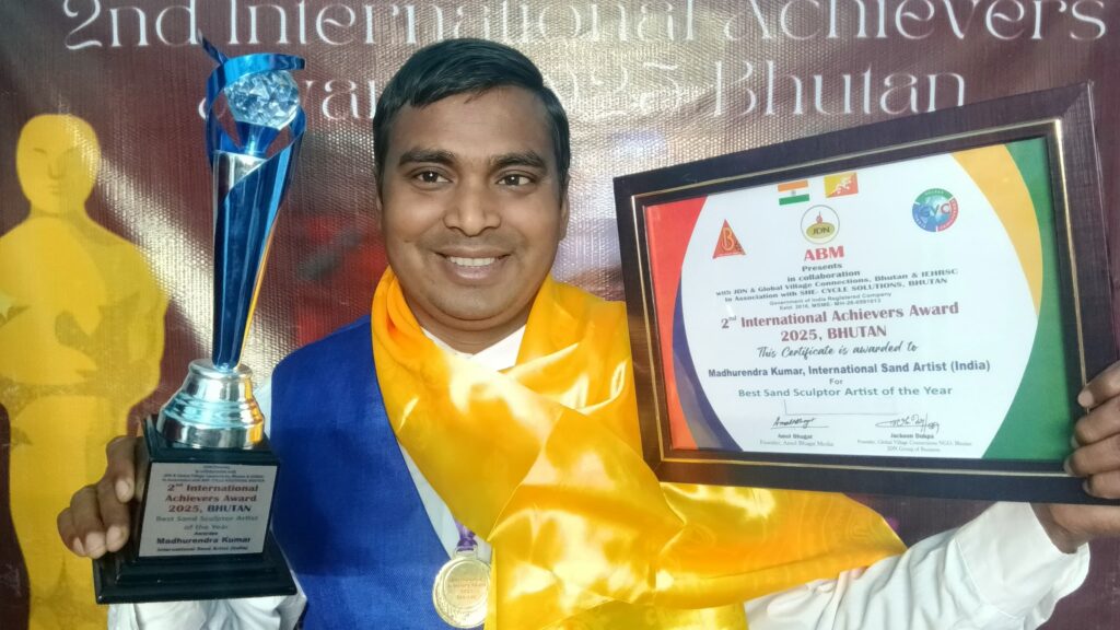 पटना/थिम्फू (भूटान)- निशांत राज। बिहार के अंतरराष्ट्रीय सैंड आर्टिस्ट मधुरेंद्र कुमार ने भूटान में आयोजित समारोह में ‘बेस्ट आर्टिस्ट ऑफ द ईयर’ अवॉर्ड जीतकर भारत का मान बढ़ाया है। यह पुरस्कार उन्हें कला व संस्कृति के क्षेत्र में भारतीय सैंड आर्ट को अंतरराष्ट्रीय पहचान दिलाने वाले प्रसिद्ध रेत कलाकार मधुरेंद्र कुमार को रेत कला के माध्यम से सामाजिक, सांस्कृतिक और जन-जागरूकता से जुड़े विषयों को प्रभावशाली ढंग से प्रस्तुत करने, साथ ही अंतरराष्ट्रीय स्तर पर उत्कृष्ट सैंड स्कल्पचर निर्माण के लिए “बेस्ट सैंड स्कल्पचर आर्टिस्ट ऑफ द ईयर” अवॉर्ड से सम्मानित किया गया।