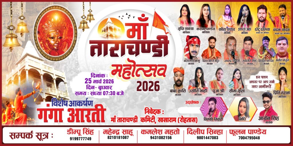 सासाराम (रोहतास)। आस्था, भक्ति और सांस्कृतिक रंगों से सराबोर होने जा रहा सासाराम एक बार फिर भव्य आयोजन का साक्षी बनने को तैयार है। 25 मार्च 2026 को माँ ताराचंडी महोत्सव के रूप में श्रद्धा और उत्साह का अद्भुत संगम देखने को मिलेगा, जहां गंगा आरती की दिव्यता और कलाकारों की प्रस्तुतियां माहौल को आध्यात्मिक ऊर्जा से भर देंगी।