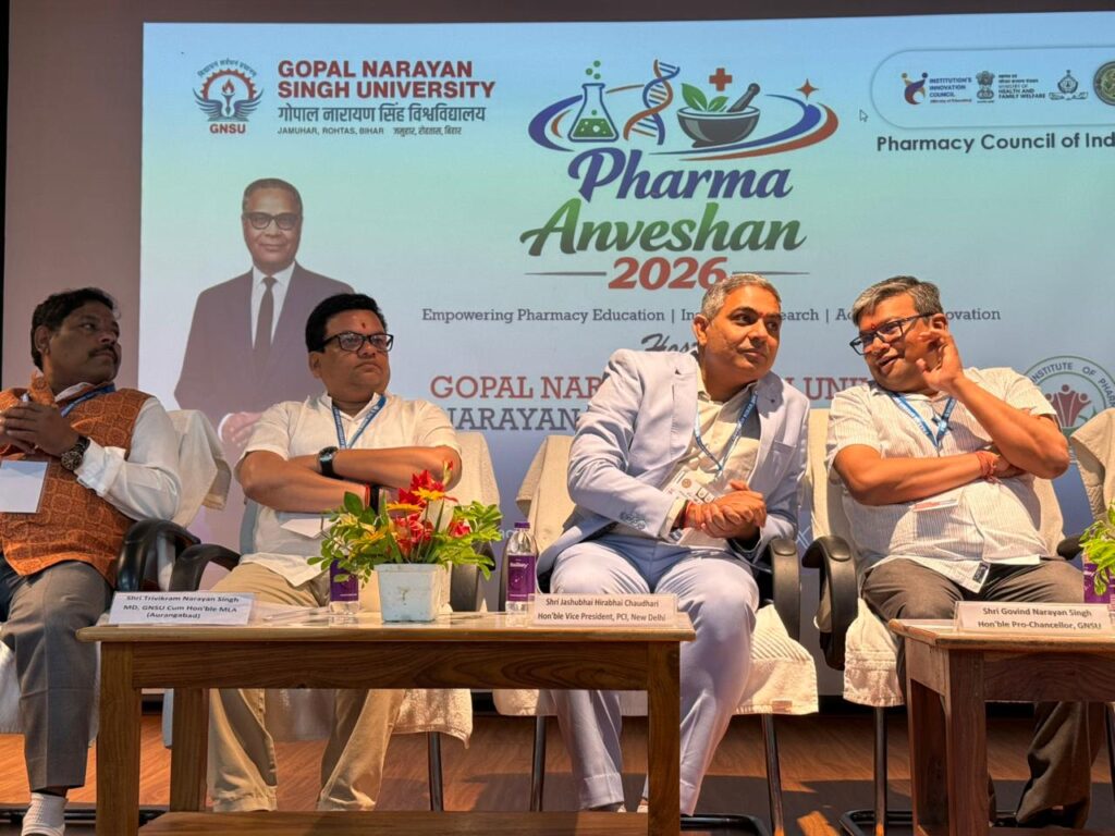 डेहरी-आन-सोन (रोहतास)- विशेष संवाददाता। गोपाल नारायण सिंह विश्वविद्यालय, जमुहार स्थित नारायण इंस्टीट्यूट ऑफ फार्मेसी में मंगलवार को राष्ट्रीय फार्मेसी शिक्षा दिवस के अवसर पर “फार्मा अन्वेषण–2026” का सफल आयोजन किया गया। यह कार्यक्रम भारत में फार्मेसी के जनक माने जाने वाले प्रोफेसर महादेव लाल श्रॉफ की जयंती के उपलक्ष्य में आयोजित किया गया, जिसमें देश में फार्मेसी शिक्षा, अनुसंधान और नवाचार को बढ़ावा देने पर विशेष चर्चा हुई।कार्यक्रम के मुख्य अतिथि फार्मेसी काउंसिल ऑफ इंडिया के उपाध्यक्ष जसुभाई हीराभाई चौधरी रहे, जबकि कार्यक्रम की अध्यक्षता परिषद सदस्य धर्मेन्द्र सिंह ने की। इस अवसर पर राष्ट्रीय औषधि शिक्षा एवं अनुसंधान संस्थान (नाइपर) हाजीपुर की निदेशक प्रो. डॉ. के. रुक्मणी विशिष्ट अतिथि के रूप में उपस्थित रहीं।