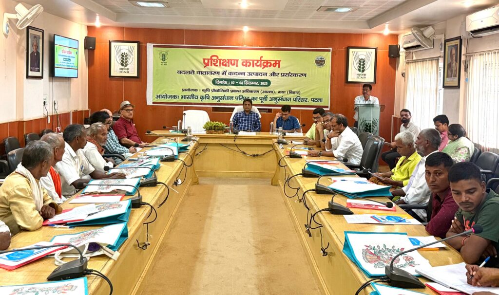 पटना- कार्यालय प्रतिनिधि। भारतीय कृषि अनुसंधान परिषद (ICAR) के पूर्वी अनुसंधान परिसर, पटना में मंगलवार को तीन दिवसीय प्रशिक्षण कार्यक्रम ‘बदलते जलवायु के परिदृश्य में कदन्न (श्री अन्न) उत्पादन एवं प्रसंस्करण’ का शुभारंभ किया गया। यह प्रशिक्षण किसानों को बदलते जलवायु परिवर्तन के संदर्भ में कदन्न (मोटे अनाज) की खेती और प्रसंस्करण तकनीकों से जोड़ने के उद्देश्य से आयोजित किया गया है।