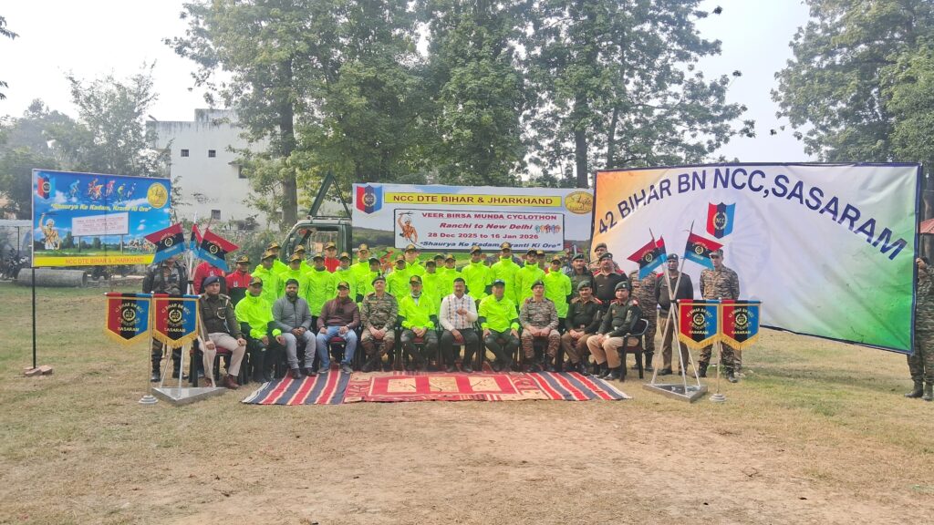 सासाराम (रोहतास)-कार्यालय प्रतिनिधि। महान स्वतंत्रता सेनानी और जननायक वीर बिरसा मुंडा की स्मृति में आयोजित वीर बिरसा मुंडा साइक्लोथन रैली बिहार के दूसरे पड़ाव पर सासाराम पहुंची। इस अवसर पर एनसीसी की 42 बिहार बटालियन एनसीसी, सासाराम में कार्यवाहक कमान अधिकारी लेफ्टिनेंट कर्नल अनूप कुमार एवं बटालियन परिवार द्वारा रैली का भव्य, अनुशासित और उत्साहपूर्ण स्वागत किया गया।